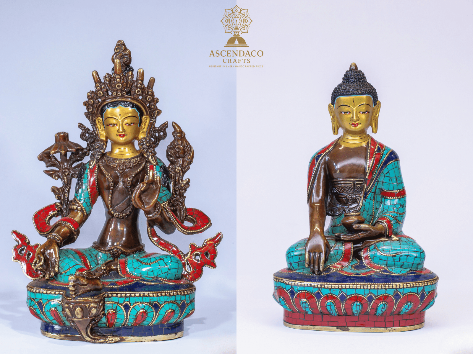 Invite divine wisdom and serenity into your home with this exquisite handmade statue set featuring Manjushree, the Bodhisattva of Wisdom, and Shakyamuni Buddha, the Enlightened One. 💫
