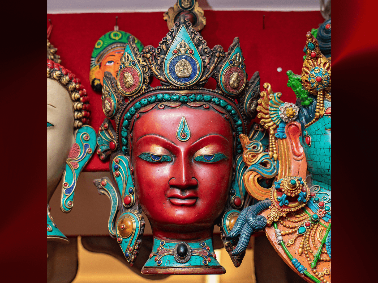 A bold representation of Tara, this red mask stands for courage and passion. Handcrafted with vibrant colors and elaborate details, it reflects Tara’s power to overcome challenges and inspire transformation, perfect for someone seeking motivation and strength.
