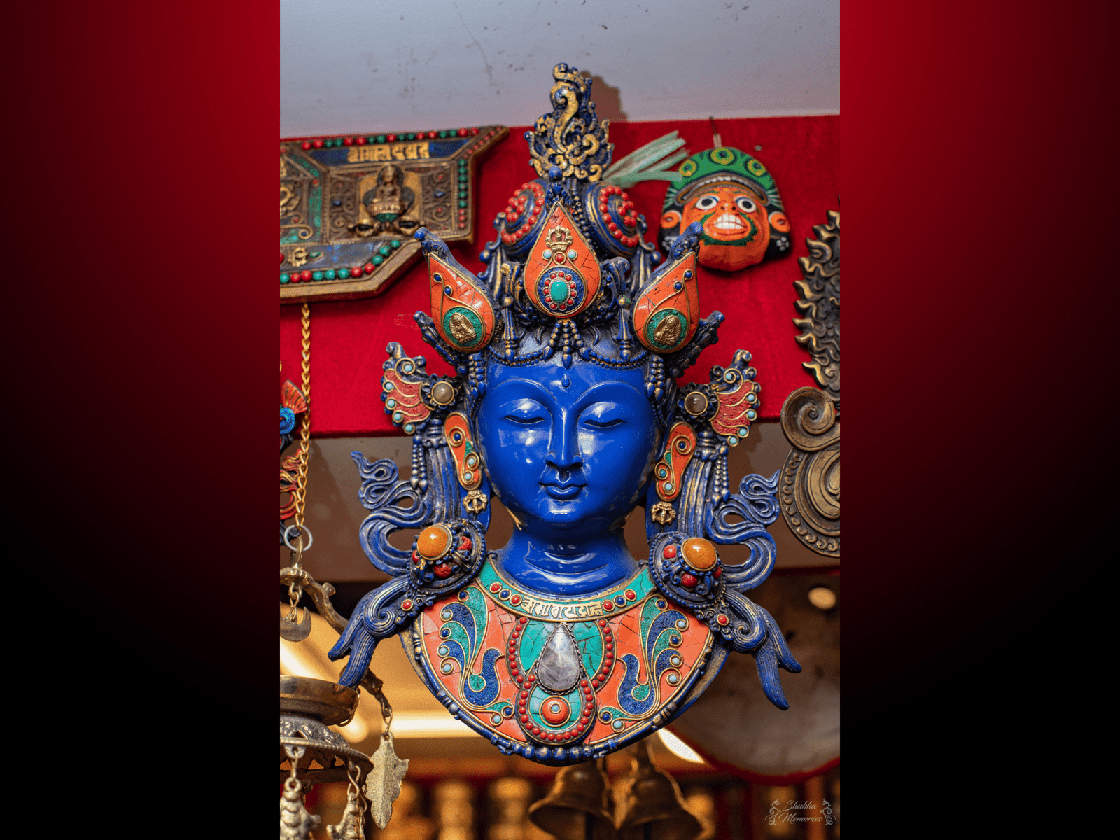 Adorned with colorful gemstones, this vibrant mask of Tara represents compassion and creativity. The blue finish brings a sense of tranquility, while the intricate details showcase the dedication of Nepalese artisans. It’s an elegant blend of spirituality and artistry.