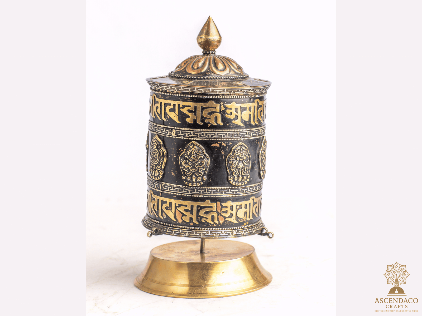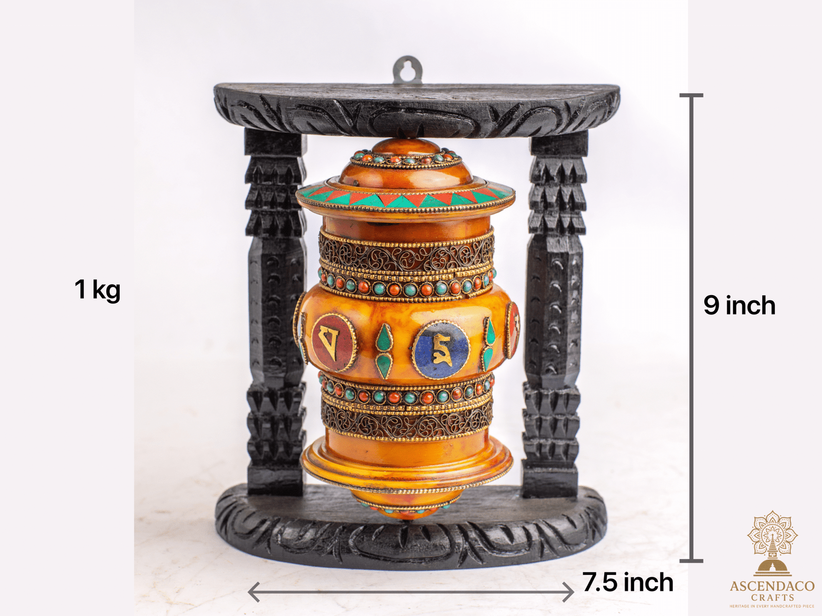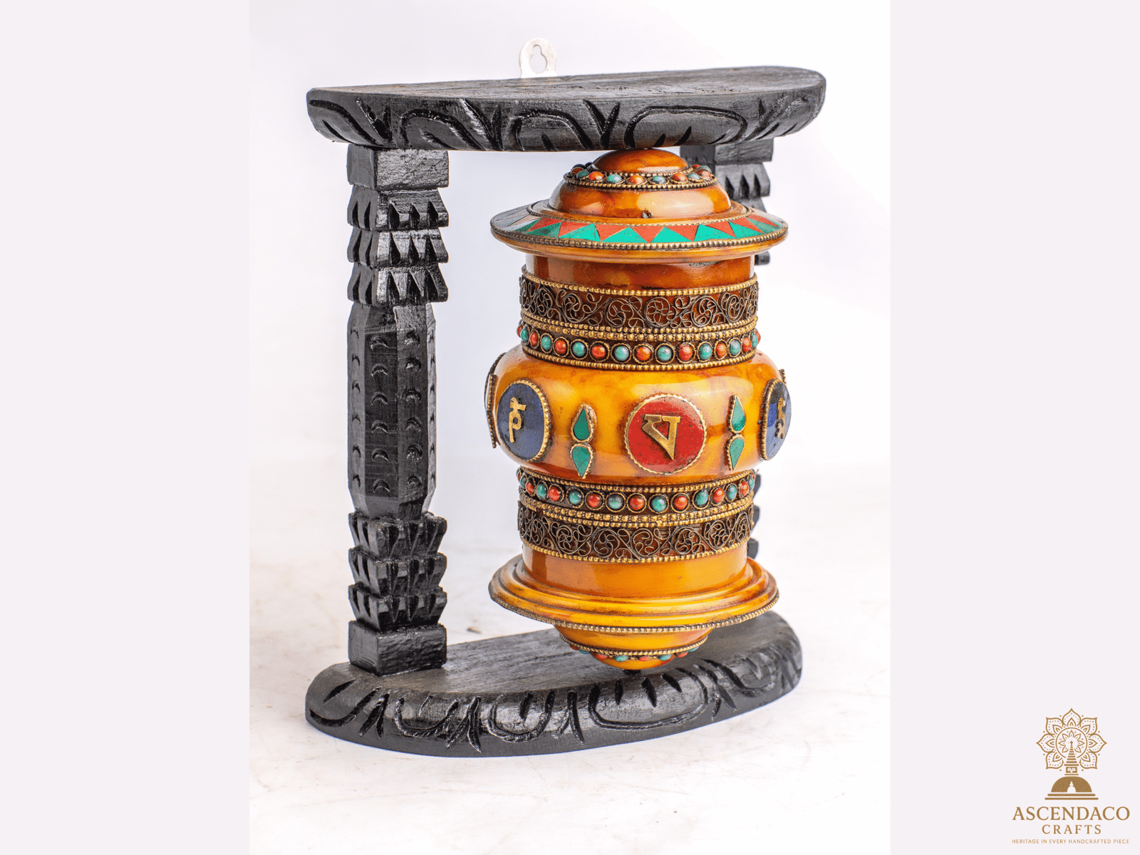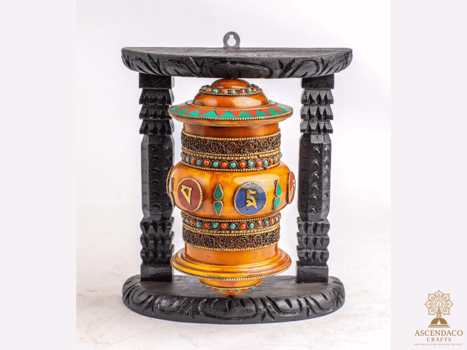 From hand-engraved carvings to amber-colored stone inlays, each prayer wheel is lovingly molded by artisans steeped in centuries-old Himalayan craft.