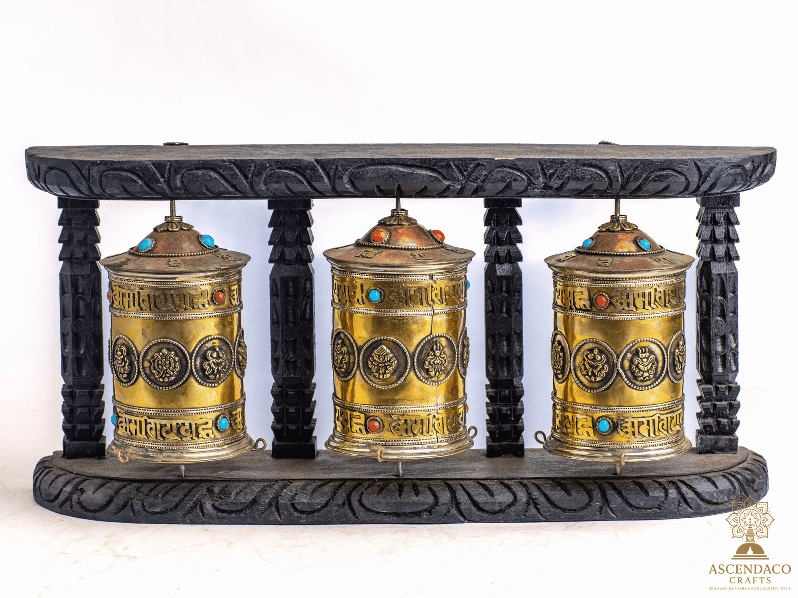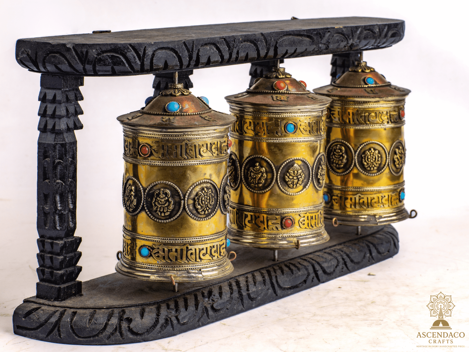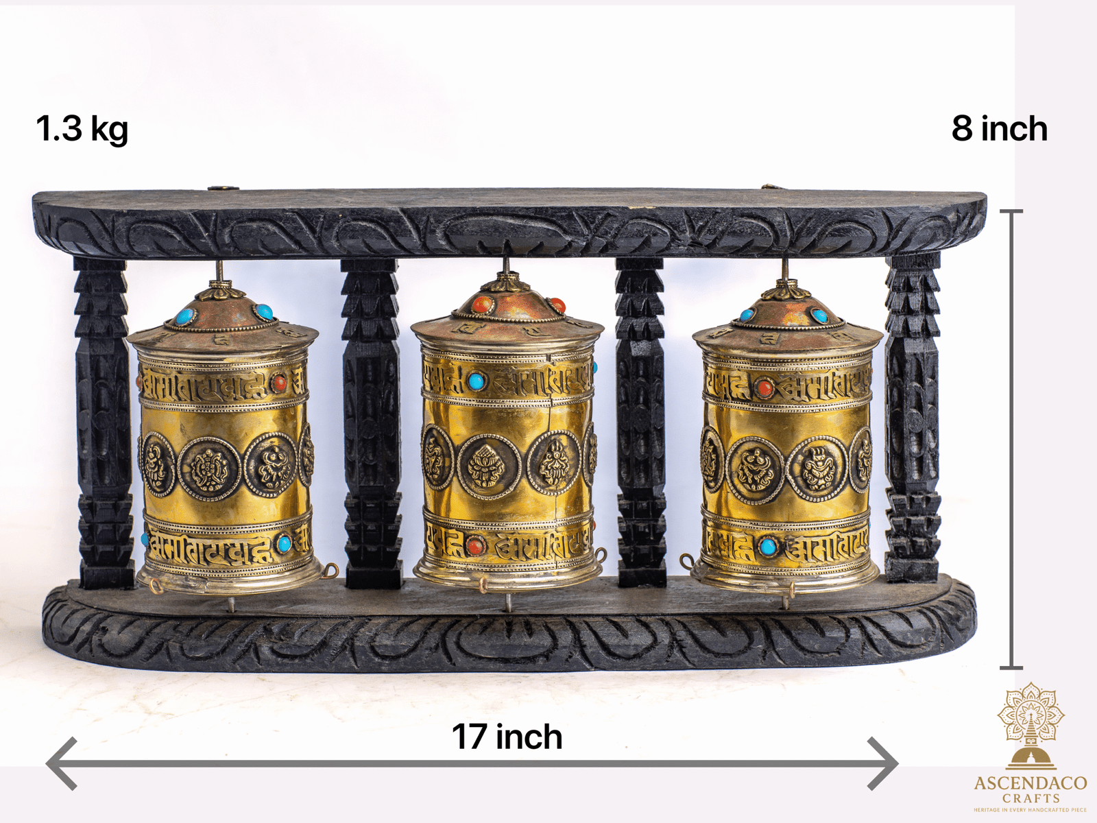 Immerse yourself in the ancient power and compassionate energy of Tibetan Buddhist tradition with this exquisite 3-piece prayer wheel (manay) set—each a masterpiece steeped in legend and spiritual symbolism.